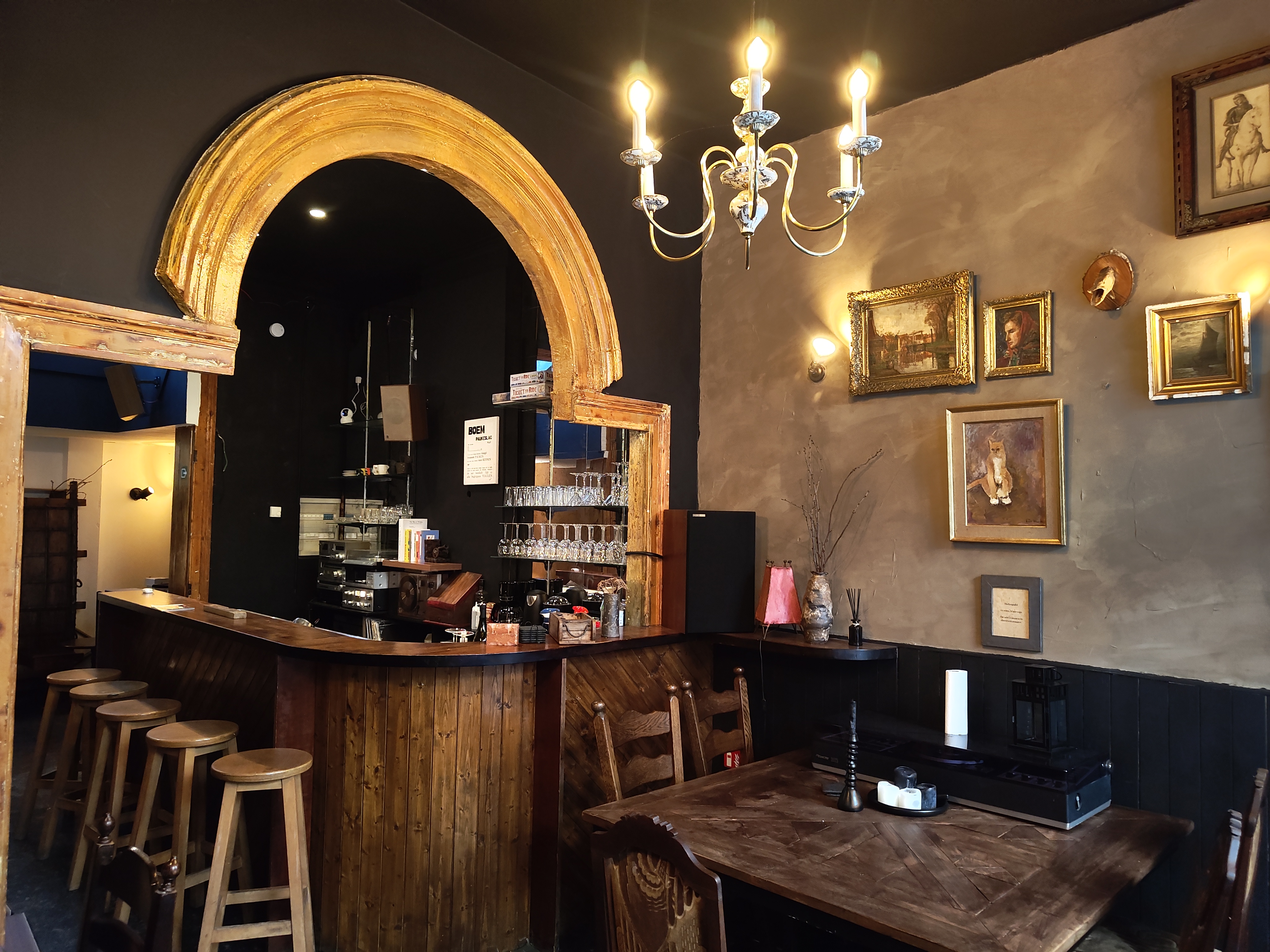 De Kwakzalver zij een herberge sonder wedergade, alwaar den dorstige en den kunstminnende zich vereenen in eenen schaduwrijk salon van hout, leder en vergeelde luister; daer vloeyt het bier als troost, de wijn als toegeeflijk sermoen, en de whiskey als pittigh brandend elixir dat het gemoed loutert, terwijl antieke stoelen kraken als oude kronieken, schilderijen met stille anarchie aen de wanden hangen, en wonderlijke klanktoestellen met koperen knoppen den toon niet stroomen maer plechtigh ontbieden; tusschen kisten vol DVD, VHS en spelconsolen van voorleden tijden wandelt men in melancholiek gepeins, verre van het woelend verkeer en de verstandelijcke slavernije des dagelijckschen arbeits, en men gevoelt, zij het kortstondigh, dat hier de fantasie noch heerscht en de tijt niet gebiedt maer gedoogt.